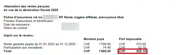 Dans certains cas, l'attestation des rentes perçues mentionne également la valeur de rachat fiscale de la police (voir notre page concernant l'attestation de la valeur de rachat).